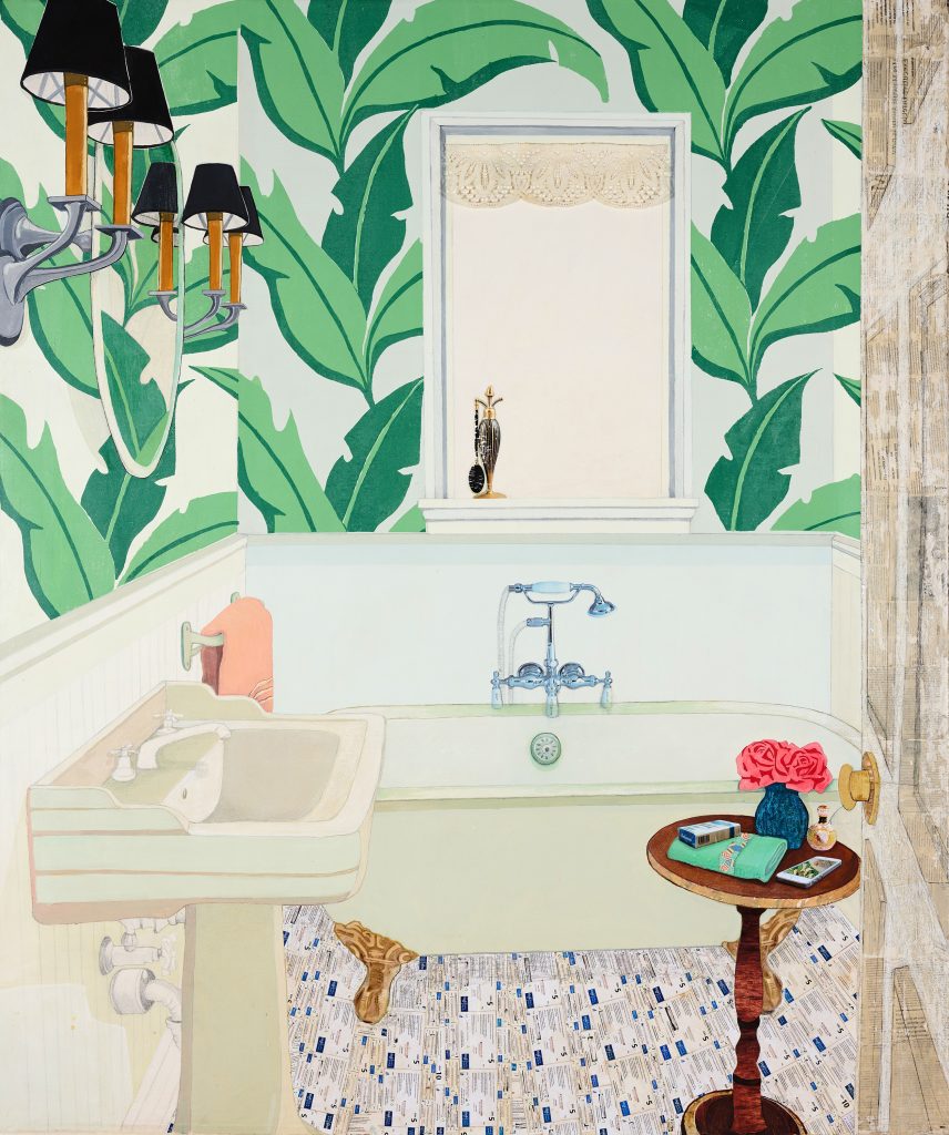 Tjaša Rener, List bananovca (vse se vrti okoli tapete), 2018, akril, sitotisk, transfer, barvni svinčnik, oglje, pastel in kolaž na platnu, 140 × 160 cm. Foto: Tomo Jeseničnik.
