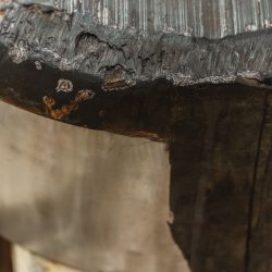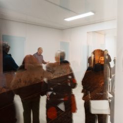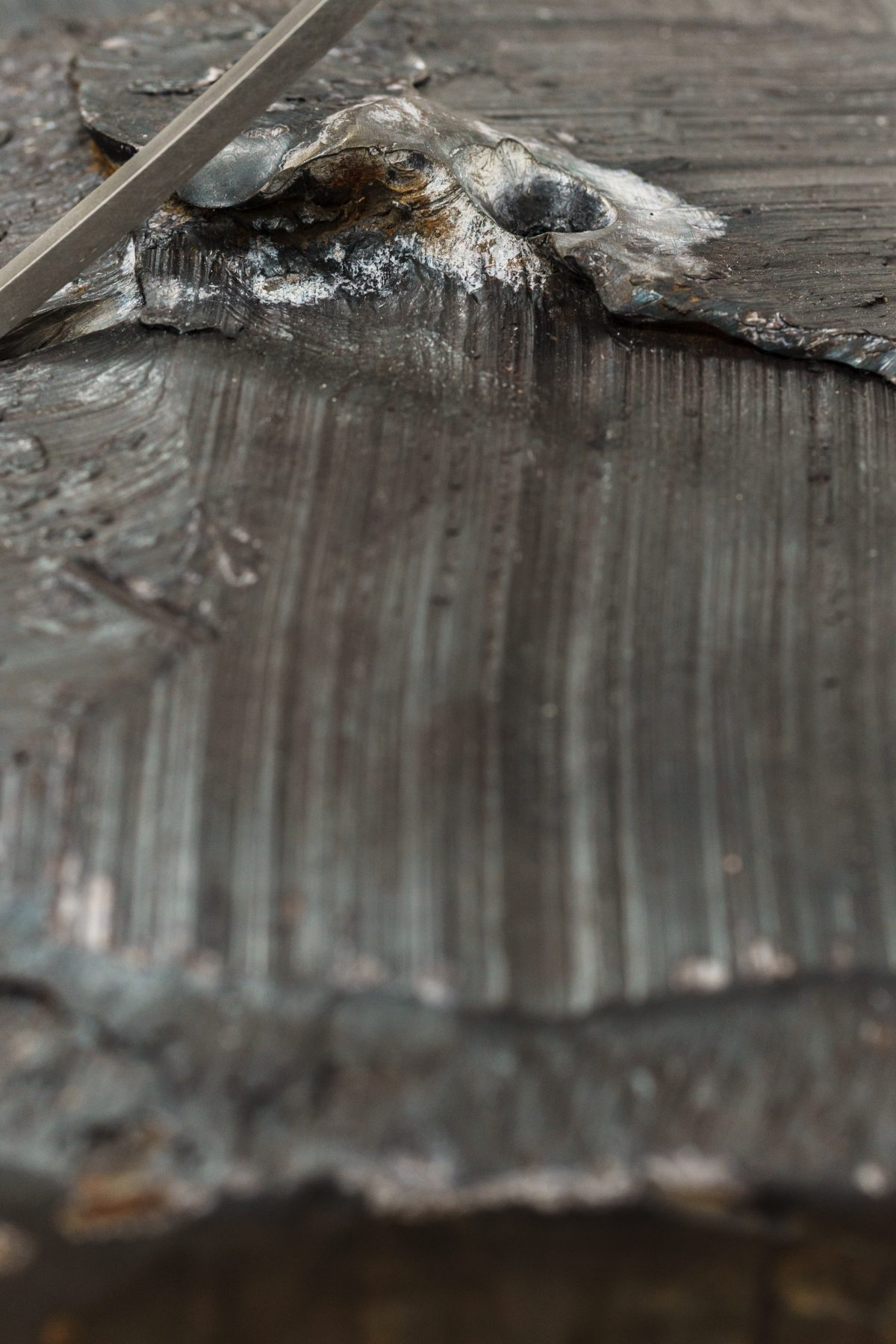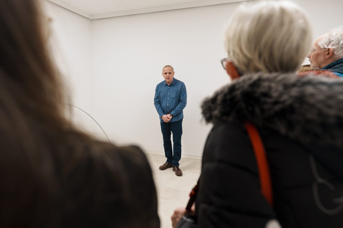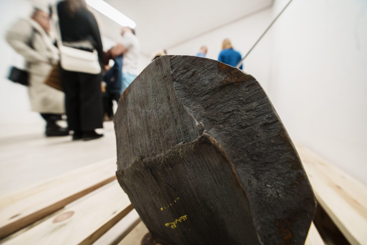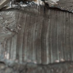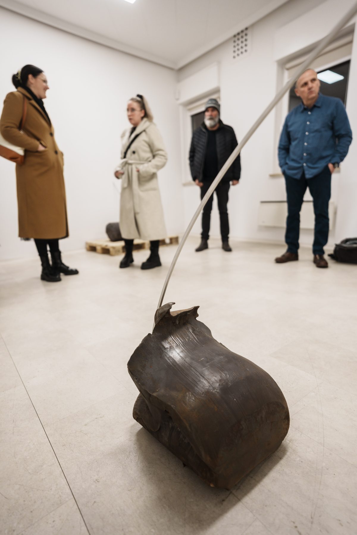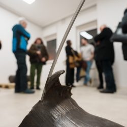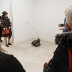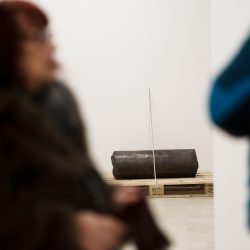 »Drčarjeva izpostavi fizikalne lastnosti kovine – njeno težo, magnetizem, teksturo – in jih prevede v subtilne prostorske namige, ki usmerjajo obiskovalčevo gibanje in zaznavanje. Masa se zdi skoncentrirana v odrezkih odkovkov, medtem ko se svetle kovinske palice prilagajajo formi in se skoraj neopazno dotikajo stene, kjer se odpre dodatna razpoka – nova prostorska os, ki povezuje kiparsko strukturo in arhitekturo prostora.«