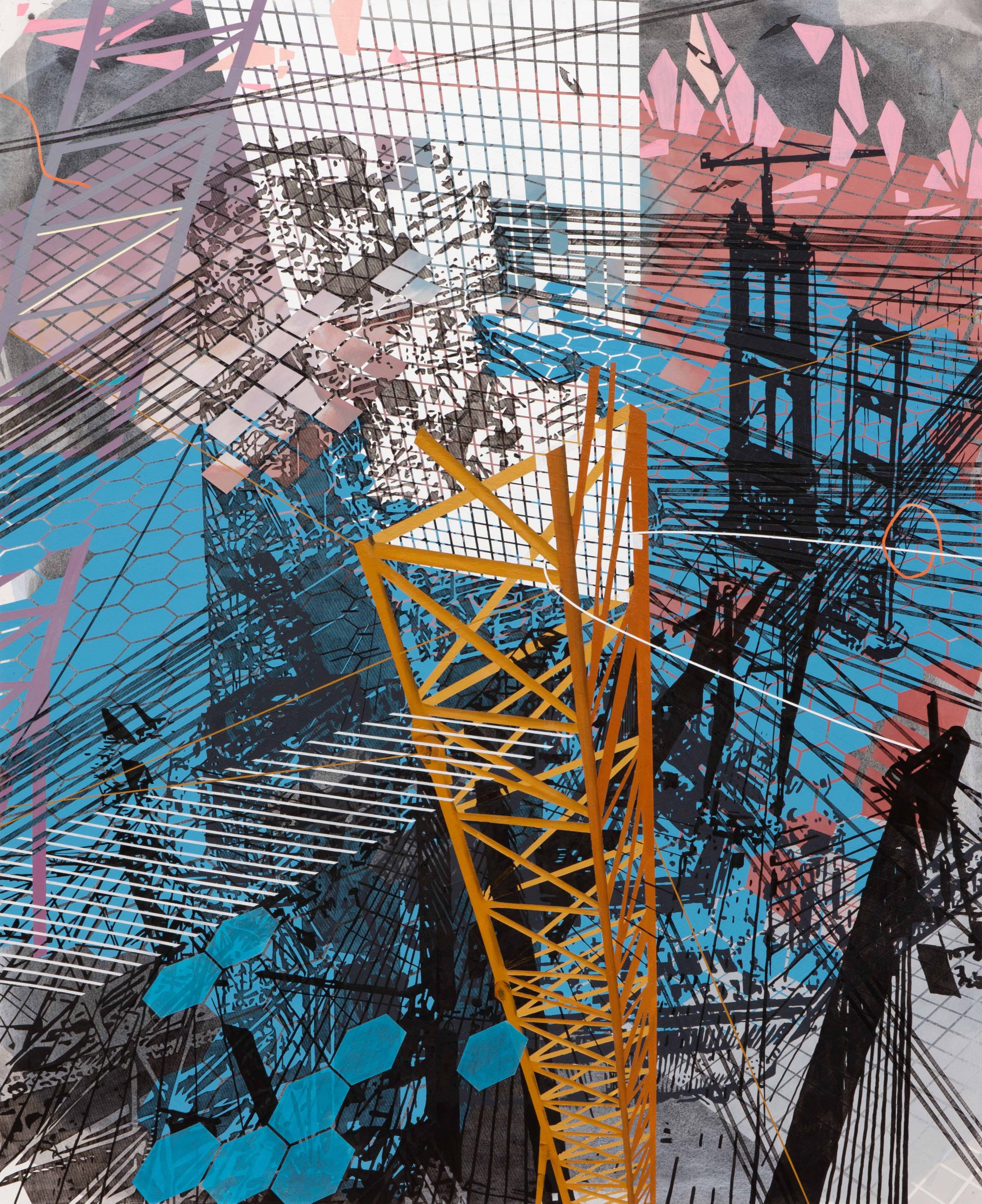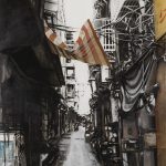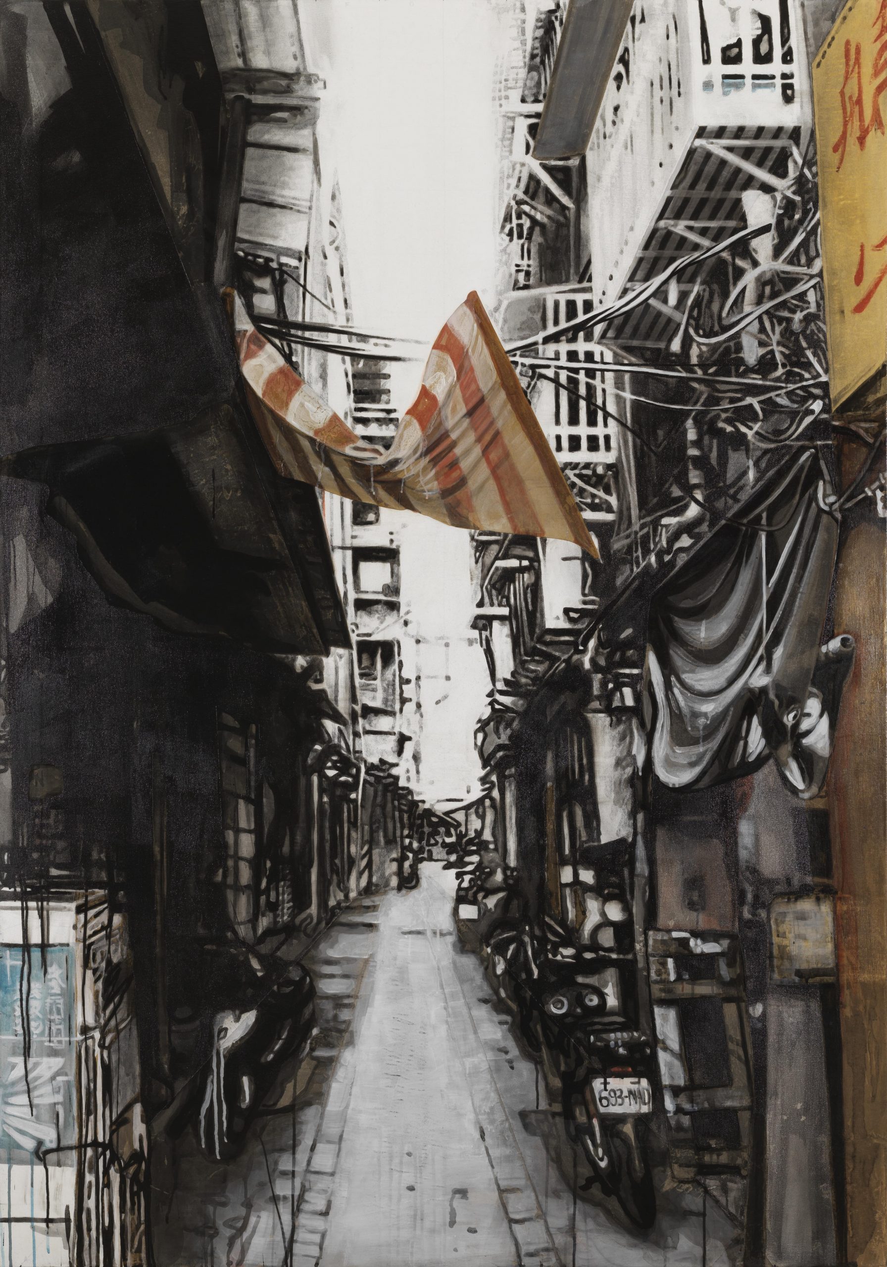 - Miha Štrukelj, Alley VIII, 2019, acrylic, ink, pencil, duct tape on canvas, 200 x 140 cmčnik in lepilni trak na platnu 200 x 140 cm